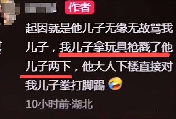 当天这名被打的男童一开始在楼下玩耍,被施暴女子的儿子无缘无故辱骂,孩子气不过,情急之下就拿起手里的玩具枪,轻轻戳了对方一下。